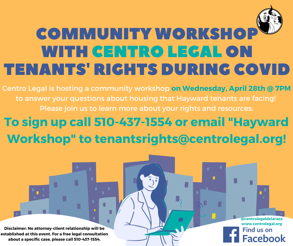 Centro Legal is hosting a FREE online workshop for tenants’ rights for Hayward tenants! Please call 510-437-1554 to sign up or email tenantsrights@centrolegal.org with the subject “Hayward Clinic” to enroll!